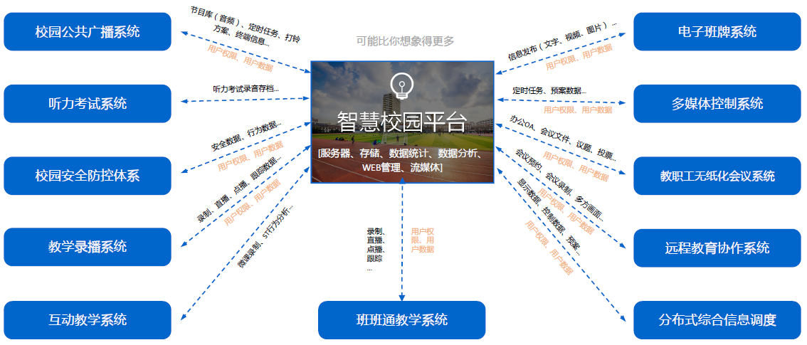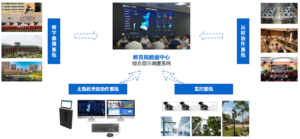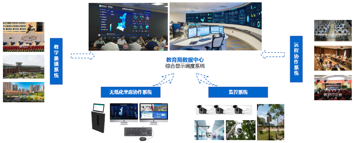 在教育局数据中心集成综合显示调度系统与无纸化坐席协作系统,与各校的录播系统、监控平台、远程视频协作系统等对接,让分布在不同地点的音视