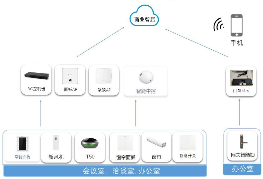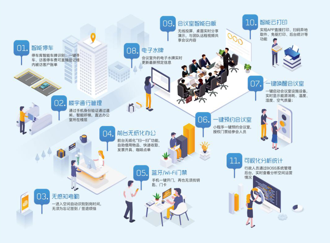 智能办公解决方案由智慧办公和智能楼宇两大模块组成,其中智能楼宇不但在某个空间的指令场景自动化方面可以做到游刃有余,更重要的,通过集成服务,将可以通过 PC、平板、手机 app,随时随地对整个楼宇的空间,定制化执行所需要的指令,更佳便捷、高效的管理你的楼宇。