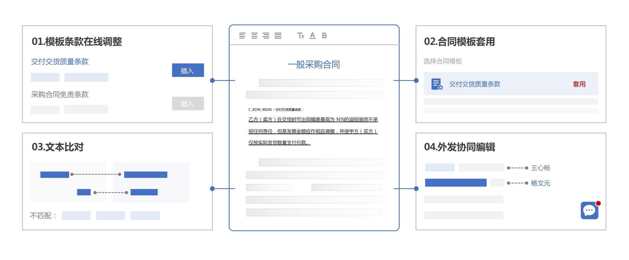拉通内外部人员实现多方在线编辑磋商,完整记录变更信息。