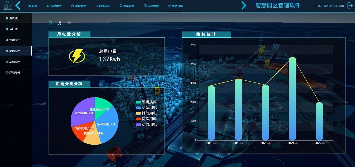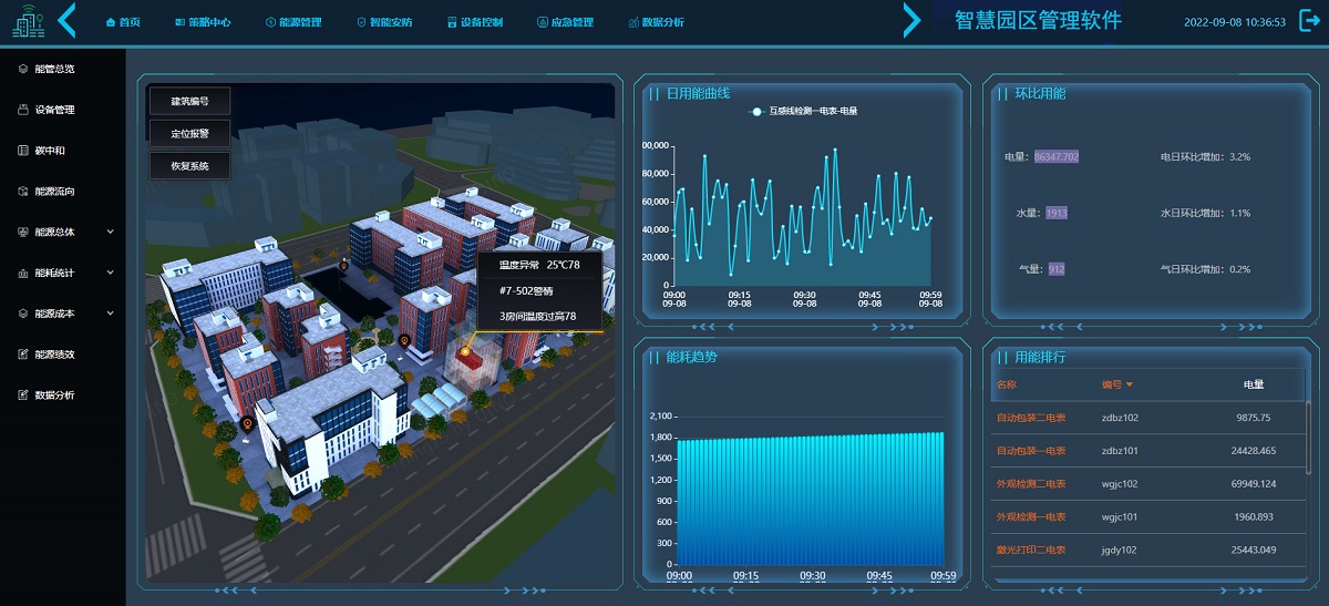 智慧园区管理软件,一个平台all in园区的设备统计、耗能统计、环境监测、周边配置等模块,实时展示园区各种数据和信息。策略中心针对园区内广告屏、广播、灯杆、工单进行任务管理。能源管理中包括能管总揽、设备管理、碳中和、能源流向、能源总体耗能统计、能源成本、能源绩效数据分析,直观展示所有能耗指标数据,量化评估能源利用效率和节能措施的效益。