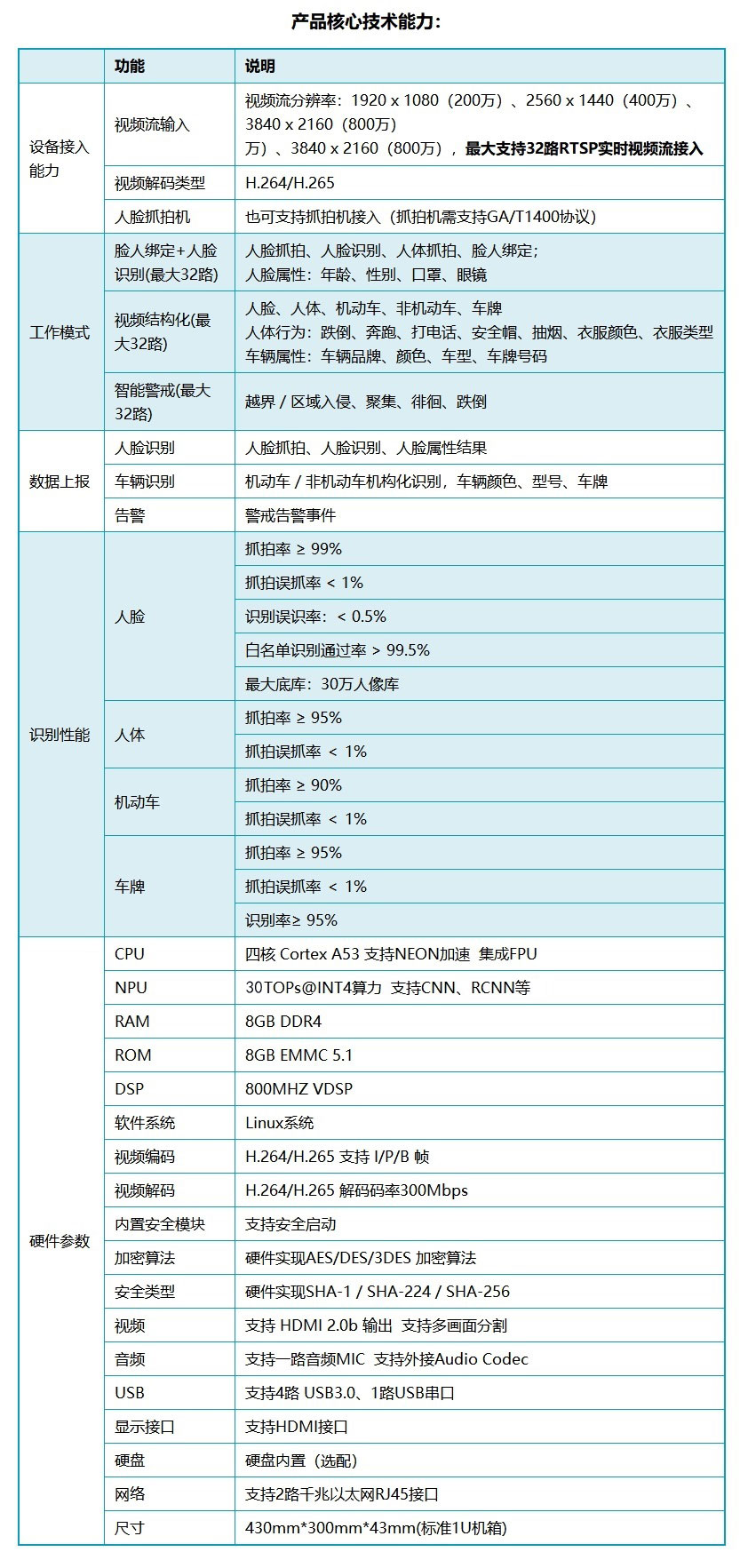 AI边缘计算盒子算法分析服务器,30T超强算力,支持32路RTSP视频流解析,识别算法包括人脸人体、车牌、烟雾火焰、安全帽、打电话、抽烟、人员聚集、工作服、离岗睡岗、电瓶车梯控、区域入侵警戒、跌倒、奔跑、衣服颜色等数十种。可应用于加油站、化工厂、工地、厂区、电力系统、电信机房、智能安防、智慧社区、校园、景区、园区等场景。