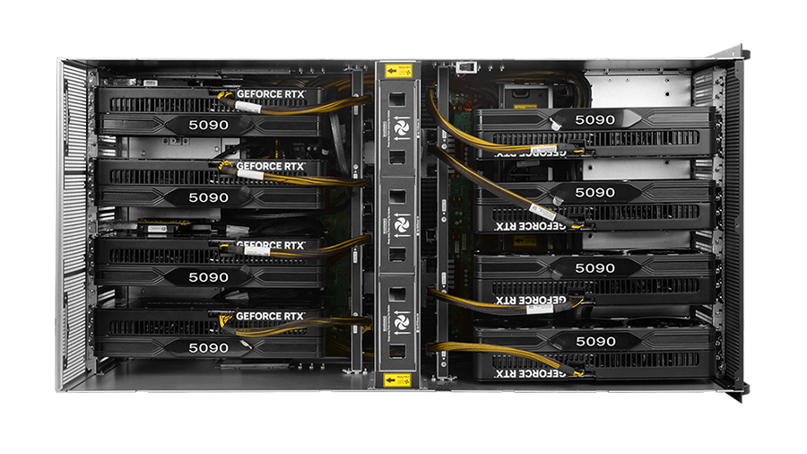 直通8卡服务器风扇版:支持 8 张 600W 3 宽、3.3 宽、3.5 宽、4.5 宽 RTX 5090 风扇卡或其他600W 风扇卡 GPU, GPU 采用前后4+4 分离上下分风道布局 直通8卡服务器涡轮版:支持 8 张 600W 2 宽、2.5 宽 RTX 5090涡轮卡或其他 600W 涡轮卡 GPU,GPU采用 8 卡后置并排集中风道散热布局 |